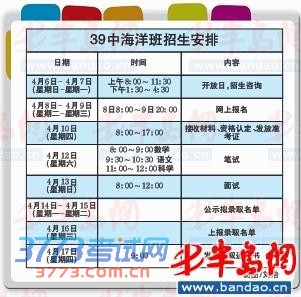 自主招生考试分笔试和面试 39中的海洋班从2011年设立以来,一直实行的是按照中考成绩划线录取。去年,39中海洋班的招生录取线甚至高出普通班录取线的 20多分。