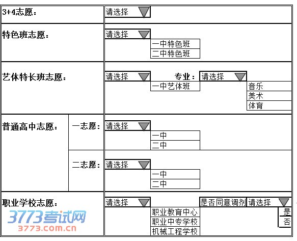 共设五个批次志愿。考生填报志愿时,需在拟报考的批次志愿里点击“请选择”字样右侧的黑色小箭头,在出现的下拉菜单中选择相应的学校或专业点击。批次志愿或专业志愿若不做选择,视为不同意报考。没有取得一中特色班、二中特色班招生和一中艺体特长班报考资格的考生请勿选择特色班和艺体特长班志愿,否则无效。