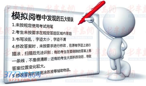 五种情况最易出错 除了客观题的涂卡之外,主观题因为考生字迹潦草而导致评卷老师看不清楚也是不少考生会出现的问题,因为答题卡扫描后在电脑屏幕上显示出来,清晰度原本就比看考卷降低一些,如果考生字迹潦草,在屏幕上显示出来的字样就更容易让考官无法辨认。同时,有的考生习惯了在试卷上做标记,这个标记如果出现在答题卡上会显得尤其明显,所以需要考生自己注意。而答题卡上贴条形码也是不少孩子会“失手”出现问题的地方,在模拟训练中,就有不少考生出现条形码损坏、超出条码粘贴区域、未贴条形码、条码污损等情况。