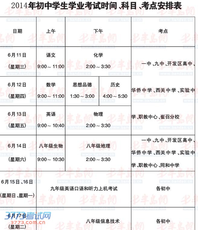 据了解,初中学生学业考试由青岛市统一组织,考试科目九年级为思想品德、语文、数学、英语、物理、化学六科,会考科目九年级为历史,八年级地理、生物、信息技术,以上学业考试科目均由青岛市教育局统一命题,统一考试时间,统一考试形式,统一网上阅卷。在考试形式上 ,其中思想品德实行开卷考试,信息技术实行上机操作考试,英语口语和听力实行上机考试,其他科目实行闭卷考试。初中学业水平考试各学科在升学成绩中的分值为:思想品德80分,语文120分,数学120分,英语120分(含口语、听力30分),物理100分,化学80分,信息技术15分,历史60分,地理45分,生物45分,体育与健康45分,总分830分。九年级考试科目思想品德、语文、数学、英语、物理、化学及会考科目历史、地理、生物、信息技术成绩均以等级和分数两种形式呈现。