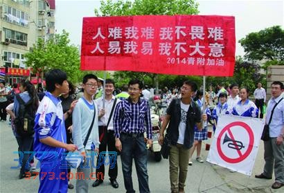 青岛附中送考老师王晓兴说,提前两周他们就把横幅做好了,然后请学校的领导和所有教过毕业班的老师在横幅上签名,昨天一早他们就赶到考点,现场给参加中考的学生鼓劲。记者于顺