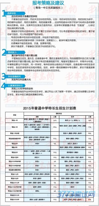 而对于很多家长关心的艺术特长生的分数线,王先军也表示,因为每年请到的评委有所区别,而专业评委打分起点不同,所以这个分数不能机械地比较。同时,需要特别提醒考生的是 ,报了一个学校的特长生之后,也可以同时报名该校的艺术班。“以青岛一中为例,特长生可以兼报艺术班,如果你只报了艺术特长生,没有报名艺术班,那我们的艺术班就不能录取。往年有很多家长,只想报特长生,不报艺术班,但后来就后悔了。”
