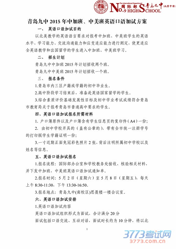 [组图]青岛九中2015年中加班中美班英语口语加试方案