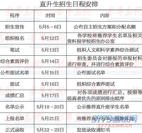 编者按:2015年中高考的大幕即将开启,平度市各级各类学校的相关招生工作序幕也已经拉开,为配合各级各类学校的招生工作。对此,本报将开辟“小邬赶考”栏目,多角度、全景式、深层次地解读相关招生政策和信息,架起学校与家长、学生的信息沟通桥梁,更好地为各类学校的招生工作以及学生家长服务。 近日,平度一中、平度九中相继公布了2015年录取优秀初中毕业生推荐直升工作方案,记者了解到,两所学校今年依旧各计划招生100人,在直升生报名条件和招生程序方面,与往年基本大致相同。其中,笔试将于5月13日举行,两所学校根据笔试成绩,分别按照1:1.2的比例,确定120人于5月16日进行综合素养面试。5月22至23日,最终确定录取名单,发放录取通知书。 报名要求会考成绩不低于2A1C 在报名条件方面,两所学校均要求学生具有高尚的道德品质和远大的理想,具有社会责任感,对中国优秀传统文化具有浓厚兴趣,自觉遵守优秀的传统美德;团结同学,热心帮助同学,积极参加各项公益活动,担任学生干部两个学期以上;具有勤奋、刻苦、专心、持久的学习品质,具有良好的自学能力。综合学习成绩在本校名列前茅。初二地理、生物、信息 技术会考成绩不低于2A1C;具有创新精神和科学素养,具有强烈的学科学习兴趣,具有阅读和写作的良好习惯;初中综合素质评定基础性发展目标均为A等;在注册初中学校连续就读三年(因户籍、房产发生变化等正常转学的学生需连续在该校就读两年或两年以上)。 报名学生需要准备的材料包括:《优秀毕业生推荐直升申报表》、《青岛市中学生素质发展手册》、《初中毕业生综合素质评价表》;2寸近期彩色照片3张;加盖学校公章的初中校长推荐信;户口簿、学生本人户籍材料复印件一份;三年来学生历次期末考试成绩证明,并且加盖公章;初中阶段取得的标志性成果材料以及荣誉证书的原件和复印件(经学校确认后,在复印件上加盖公章)。学校招生办公室对提报的申报材料进行审查,并根据初中推荐方案的赋分办法对学生提报的材料进行审核、量化,分为A(20%)、B(40%)、C(35%)、D(5%)四个等级。 笔试包括人文和科学素养两部分 在5月13日举行的笔试科目平度一中包括科学素养与人文素养两部分,科学素养考试时间180分钟,满分160分,其中数学90分钟,80分;理化90分钟,80分;人文素养考试时间120分钟,满分140分,其中语文占80分,含10分古诗文默写,英语60分。平度九中科学素养考试时间180分钟,满分200分;人文素养考试时间120分钟,满分150分,其中语文80分,英语70分,人文素养主要考查语文、英语等学科的基础知识和基本技能。科学素养主要考查数学、物理、化学等学科的基础知识和基本技能,其中数学100分,考试时间为90分钟;物理65分,化学35分,考试时间90分钟。两所学校的命题紧密结合学生生活学习实际,着重考查学生的基本素养和运用知识分析解决问题的能力以及创新思维能力。根据笔试成绩划分为A(20%)、B(40%)、C(35%)、D(5%)四个等次。 根据笔试成绩,各学校按照1:1.2的比例,确定120人进入面试。学生参加面试答辩,考查学生的语言表达能力、辩证思维能力、创新和实践能力、人生价值观与道德素养等方面。面试成绩为100分,划分为A(20%)、B(40%)、C(35%)、D(5%)四个等次。 录取名单将向社会公示三天 在最终录取办法上,平度一中根据学生综合测试结果(综合素质评定、笔试、面试),按照高等次多者优先的原则录取;如果等级完全相同,则笔试成绩高者优先,其次面试成绩高者优先,再次综合测试成绩(在综合测试成绩中,笔试、综合素质评定、面试,三项成绩的所占比重依次为60%、22%、18%)高者优先。一次性拟录取100名优秀学生为直升班学生。录取后学生单独编班。平度九中依据学生的综合素质评定、笔试、面试等级,按照高等级多优先录取的原则录取,如果等级完全相同,则以笔试与面试成绩之和高者优先,笔试与面试成绩之和相同时,则以笔试成绩高者优先,一次性录满100人。录取后学生单独编班。 对拟录取的学生,两所学校将通过学校网站向全社会公示,时间为三天。公示无异议后正式录取。平度一中直升生招生咨询和投诉电话:88392068,88392020。平度九中直升生招生咨询电话:88307668,88307578。 记者 邬明洋 (来源:半岛网-半岛都市报