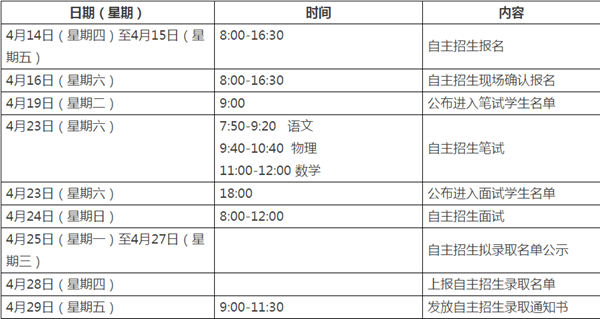 学校于4月25日(星期一)至4月27日(星期三)公示拟录取名单,公示无异议后报市教育局。4月29日发放录取通知书。被自主招生录取的学生不再参加初中学业水平考试,不再参加其他任何学校录取。
