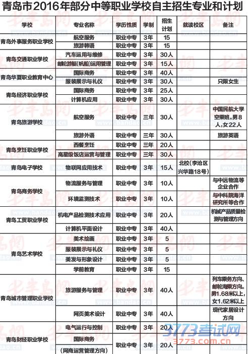 4月12日,记者从市教育局采访了解到,2016年部分中等职业学校自主招生工作方案已经下发。市内三区的12所中职学校共提供了26个专业共555个计划,专业数量和计划数量均较去年大幅缩水。与普高的自招政策不一样,参加自主招生的考生均应参加初中学业水平考试,自主招生录取的市内三区初中毕业生可以兼报普通高中。各个学校的报名从4月21日开始,至4月23日结束。 招生专业比去年少19个 记者从下发的各中职学校招生方案中看到,有自招计划的市内三区中职依然有12所,与去年一样。但对比下来,招生专业数量和招生计划比去年大幅缩水。2016年,12所中职共给出了26个专业,比去年的45个专业减少了19个。例如,青岛华夏职业教育中心去年有9个专业自招,今年骤减至2个专业。而招生计划上,今年12所中职提供了555个计划,比去年的785人减少230个计划。 “随着中职招生模式的不断多样化,中职自招在专业和招生计划上也在逐渐精简,这可能是数量和人数下降的原因。不过精简以后,中职拿出来自招的专业是学校的优势专业。”市区一所中职的负责人告诉记者。招生的12所中职学校为:青岛外事服务职业学校、交通职业学校、华夏职教中心、经济职业学校、旅游学校、烹饪职业学校、电子学校、商务学校、工贸职业学校、艺术学校、城市管理职业学校、财经职业学校。 自招录取生可兼报普高 市教育局规定,自主招生录取以学校自主招生测试成绩为准。参加自主招生的考生均应参加初中学业水平考试,初中学业水平考试成绩仅作为初中毕业和兼报普通高中志愿录取的依据。与普高的自主招生被录取后不再参加中考等相比,中职自招的可选择性比较大,自主招生录取的市内三区初中毕业生可以兼报普通高中。 但是按照规定,被职业学校自主招生录取的考生,不能再报考其他职业学校(包括:“3+4”本科、高等师范专科和普职融通实验班、五年制高职、中等职业学校和技工学校)。被普通高中录取的考生,中职学校自主招生录取资格取消。 其他区市考生应按本区市有关规定进行报名。另外,市教育局规定,职业学校自主招生录取未满额计划转入统一录取时中职批次录取。 4月21日至23日报名 记者从各校的招生方案中看到,学校都是于4月21日开始报名,到23日结束。学校的报名要求并不高,大部分学校要求生物、地理等级达到D级以上即可报考。测试有面试等环节,测试难度不大。考生和家长若想了解更多自招政策,可扫描文后二维码关注“半岛教育直通车”微信公众号。 考生需要注意:市内三区考生被职业学校自主招生录取的,如兼报普通高中志愿,须于5月19日(星期四)8:00至5月21日(星期六)20:00,登录“青岛市初中学业水平考试(高中阶段学校招生)管理平台”(网址为:http://wsbm.qdedu.gov.cn/),进行网上填报普通高中志愿。考生应在规定时间到报考的一志愿普通高中确认报考信息。 另外,市内三区考生被职业学校自主招生录取的,如不兼报普通高中志愿,须于5月19日(星期四)8:00至5月21日(星期六)20:00,登录“青岛市初中学业水平考试(高中阶段学校招生)管理平台”(网址为:http://wsbm.qdedu.gov.cn/)报名参加初中学业水平考试,在普通高中批次填报“只参加毕业考试”选项,此类考生不需要进行现场确认报考信息。记者 魏海洋