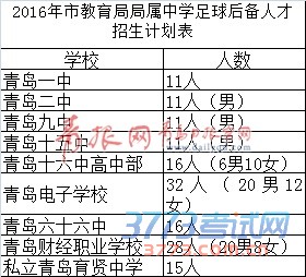 有家长迫切希望增加开设足球专业的数量,但因青岛各学校体育艺术特长生专业的设定是根据学校传统办学特色和专业确定,各学校足球后备人才的报名资格是不尽相同。所以各学校体育、艺术特长生招生的计划、类别、专业等原则上保持相对稳定。青岛今年有9所高中学校可招收足球后备人才,分别为1中、2中、9中、15中、16中高中部、电子学校、66中、财经职业学校、私立青岛育贤中学,共151个名额。
