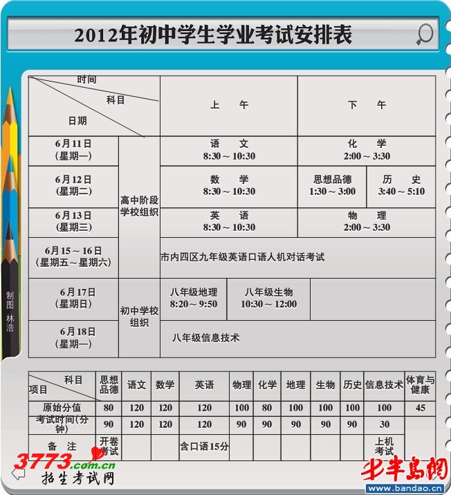 今年九年级考试、会考时间安排在6月11日至13日,英语口语考试安排在6月15日至16日,八年级地理、生物会考安排在6月17日,信息技术会考安排在6月18日。市教育局还要求,学业水平考试前,各区市原则上不再组织统一的模拟考试,各区市也不得再统一组织其他形式及科目的考试、加试、实验操作测查等。