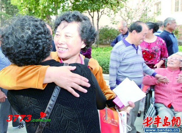 58中校庆庆典上,两位老同学见面紧紧地拥抱在一起。
