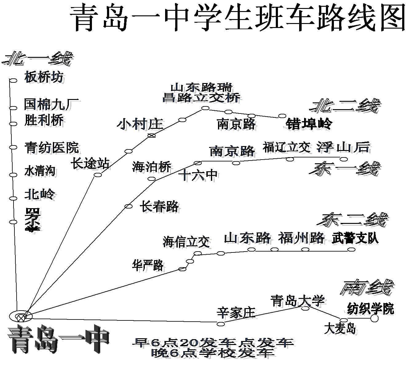 我校因面向市内三区招生,所以学生居住比较分散且有的距学校较远,又由于一少部分学生因特殊原因不能住校,学校克服困难,于2004年首开高中学校学生班车之先河,为走读学生提供了安全、快捷、便利的交通条件,节省了学生大量的宝贵时间,也省却了顶风冒雨、嘈杂拥挤的奔波之苦。学生班车分北一线、北二线、东一线、东二线、南线共五条线路:北一线沿305线,途径四方小学、北岭、水清沟、青纺医院、胜利桥、国棉九厂、晓翁村、李沧公园,终点站为板桥坊。北二线经过长春路、长途站、小村庄、温州路、重庆路和山东路立交桥、南京路、哈尔滨路,到错埠岭终点站;东一线沿威海路、鞍山路、16中、辽阳西路、福州北路、至浮山后小区终点站。东二线沿海边,走香港西路、华严路、芝泉路、海信立交桥、镇江路、徐州路、南京路、福州路,到达武警支队终点站;南线沿海边,经香港西路、香港中路、辛家庄、青岛大学、大麦岛,到青岛纺织工学院终点站。五条线路几乎覆盖了市内的所有区域,为学生上学的安全便利提供了保证。
