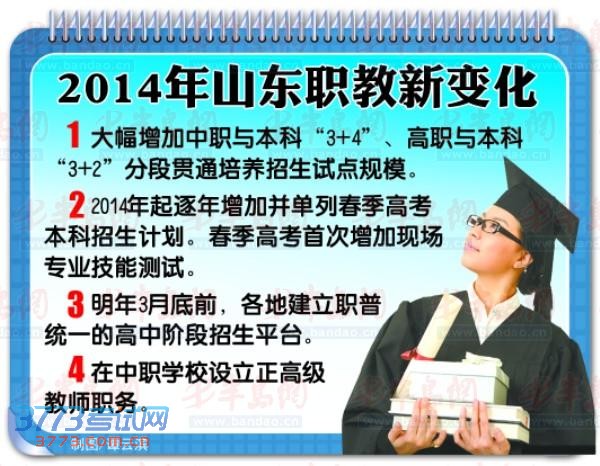 青岛将开展中职学校与普通高中学分互认、学籍互转试点。9月29日,山东省教育厅联合省发展改革委、省经济和信息化委、省财政厅、省人力资源社会保障厅等举行新闻发布会,就山东推进现代职教体系建设实施进行了介绍。从明年起,山东省春季高考的本科招生计划、“3+2”对口贯通分段培养试点、职业院校教师招聘等政策都将进行改革。