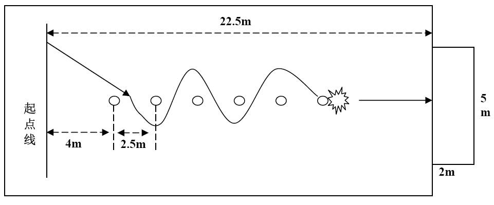 2.考试要求:考生从起点出发,球动开表计时,考生运球须依次绕杆,过最后一杆后射门,球至球门线时停表,射门不中无成绩,射中门框算进门。考生测2次,取最好一次为最后成绩。