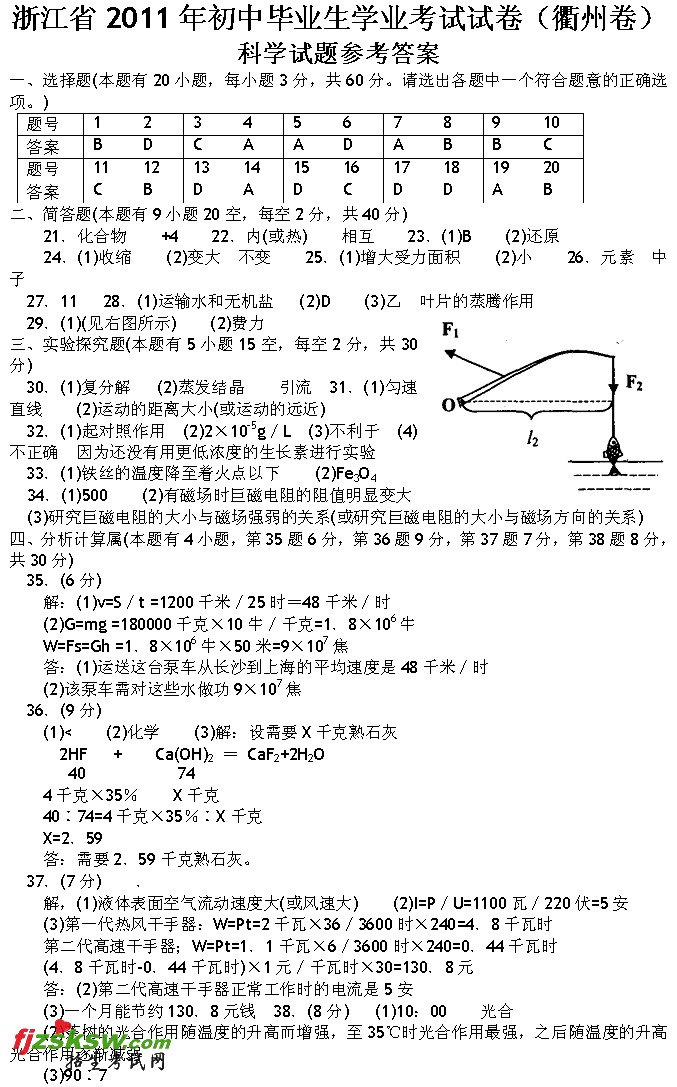 [组图]浙江衢州2011年中考物理试题及答案
