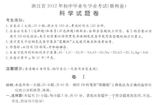 [组图]2012年衢州中考科学试卷答案及评分标准