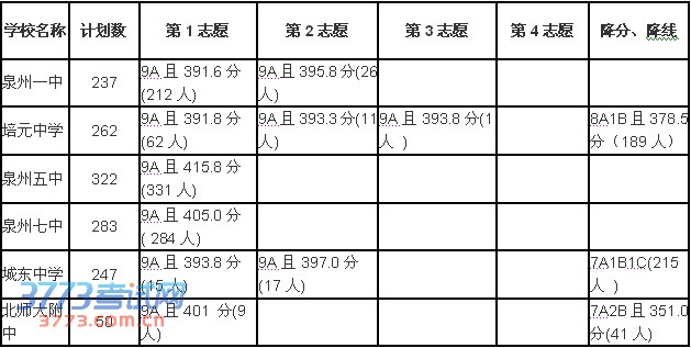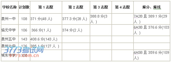 泉州网讯7月19日讯(本网记者 郭巧燕) 7月19日下午,泉州市教育局召开2013年市区普通高中招生录取切线会。根据今年的招生文件规定,市区四所省一级达标高中面向外县(市、区)招生以及市区招收推荐生没有完成计划所剩余的名额,调回市区纳入统招批次录取。因此,对7月15日初步划定的“统招生”批次的最低录取控制线进行调整,现将调整后的分数线和各批次切线情况公布如下: