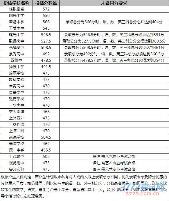 [图文]2015上海奉贤区中考高中录取分数线公布