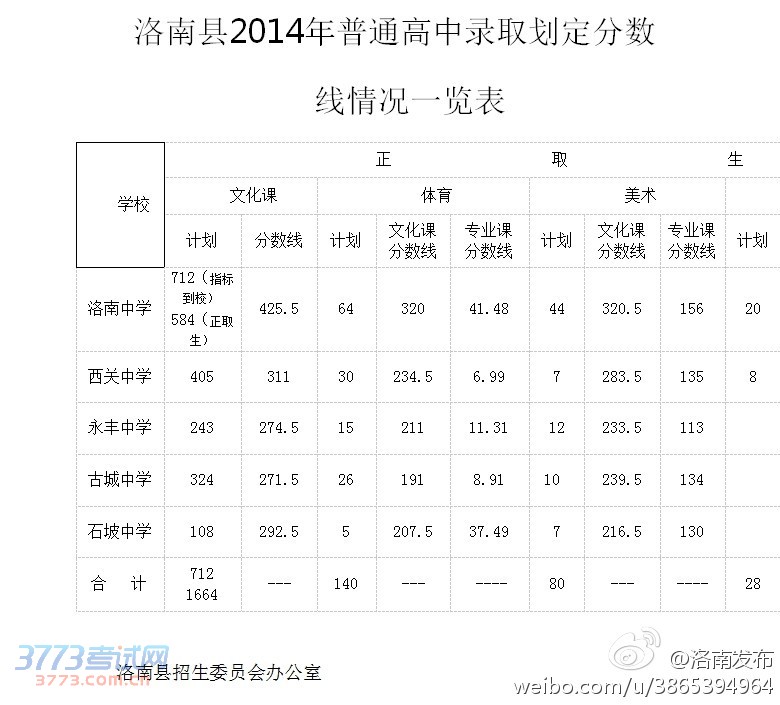 洛南县2014年普通高中录取划定分数已公布。洛南中学文化课分数线425.5,体育生文化课分数线320,美术生文化课分数线320.5。西关中学文化课分数线311。详细见下表