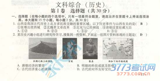 及时公布山西中考试题、答案和中考作文。祝各位考生都能取得好的成绩。2015山西中考文综试题及答案(图片版):