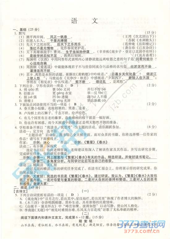 公布山西中考试题、答案和中考作文。祝各位考生都能取得好的成绩。2015山西中考语文试题及答案(图片版):
