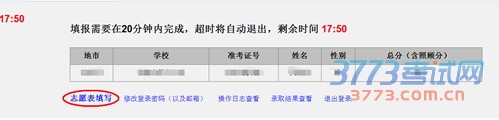 页面左上角和正上方都有操作时间倒计时,考生需在20分内完成本次志愿填报。单击“志愿表填写”,即可开始志愿填报。
