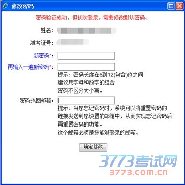 系统要求考生密码应由6到12位数字或字母构成,其中字母不区分大小写。为安全起见,建议考生密码同时包含数字和字母。为防止考生遗忘密码,系统为考生提供了邮箱找回密码功能。考生在此页面键入新密码和邮箱后(密码找回邮箱非必填项),点击“确认修改”按钮,密码修改成功后系统会弹出“密码修改成功”提示框,点击“确定”后,系统将返回初始登录页面,考生需使用新密码重新登录。