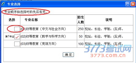 再单击所选专业前面的方框,系统会自动有方框内打上红色“√”,表示该专业已选定。需要注意,您勾选专业的顺序,代表了您填报专业的意愿程度。勾选后,方框前会显示您选择专业的顺序。例如下图,第三横栏的初等教育(现代信息技术方向)为第一次点击打勾,则为第一志愿;初等教育(数学与科学方向)是第二次点击打勾,则为第二志愿;初等教育(英语方向)为第三次点击,则为第三志愿。