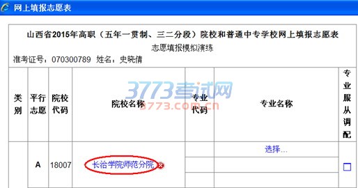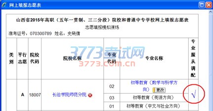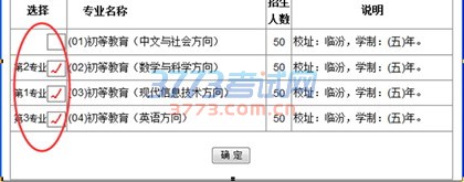 每所高职院校您最多可能选报三个专业。中专学校不填专业。专业选报结束后,单击确定按钮,返回如下页面: