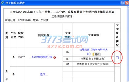 考生如要变更已勾选的“专业服从调剂”志愿,可直接单击要变更的院校的专业服从调剂栏中的蓝色“√”(如下图),变成方框即可。