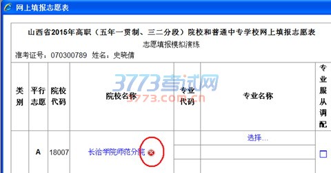 考生如删除已填报的院校志愿,可直接单击要删除的院校后面的红色“×”(如下图):