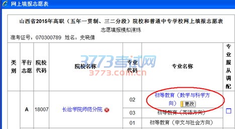 考生如要变更已填报的专业志愿,可直接单击要变更的院校的专业栏中的第一专业(如下图),进入专业选择页面,重新选择。