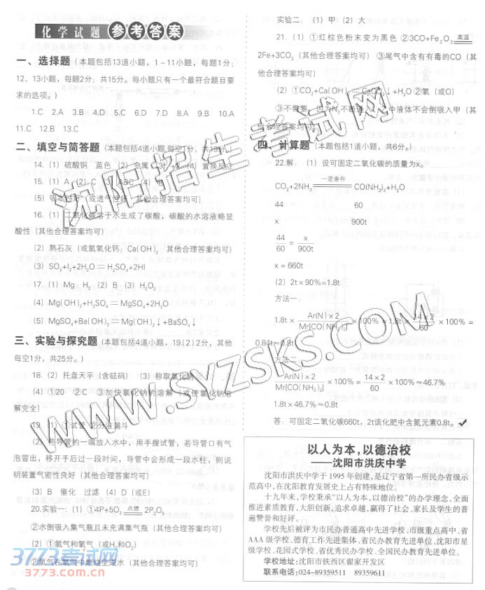2014年沈阳市中等学校招生统一考试理综合试题与参考答案