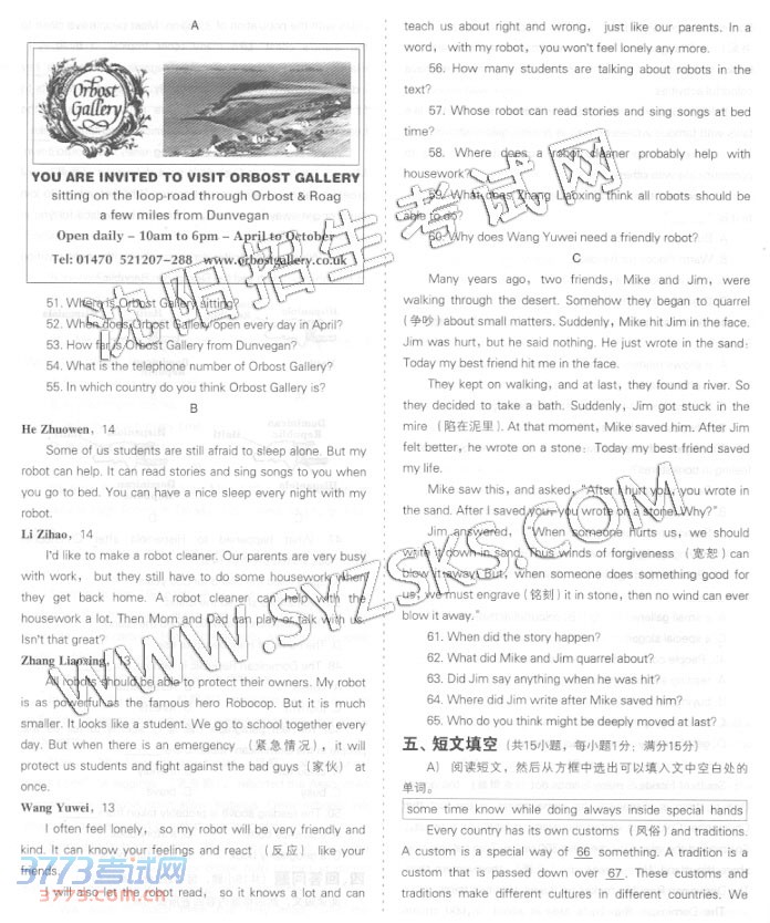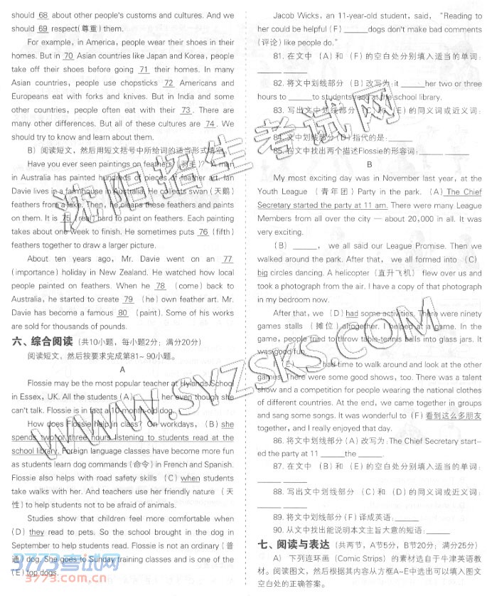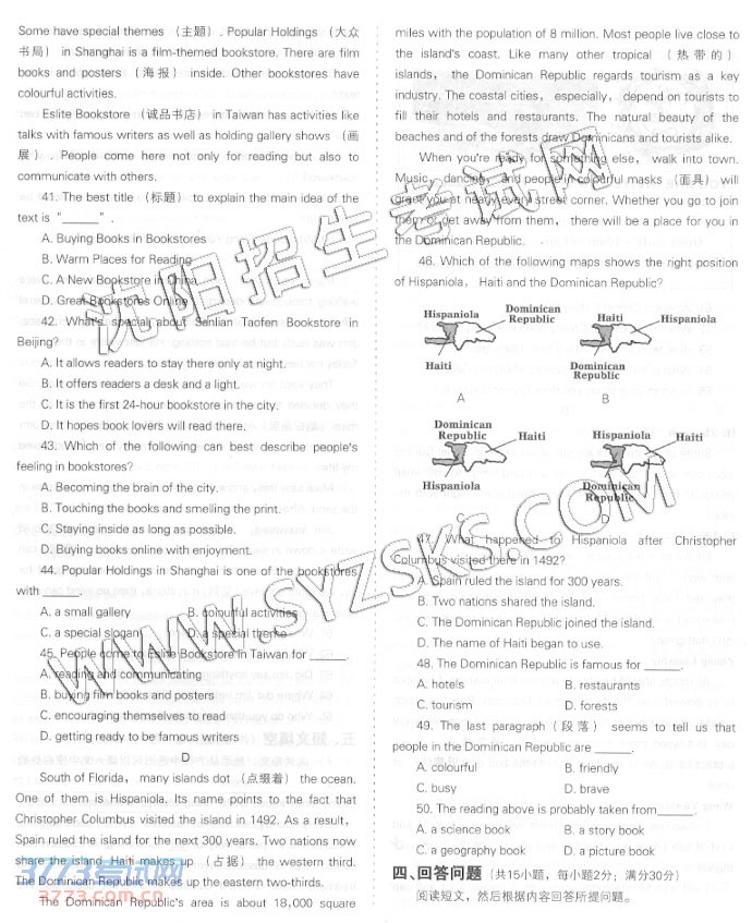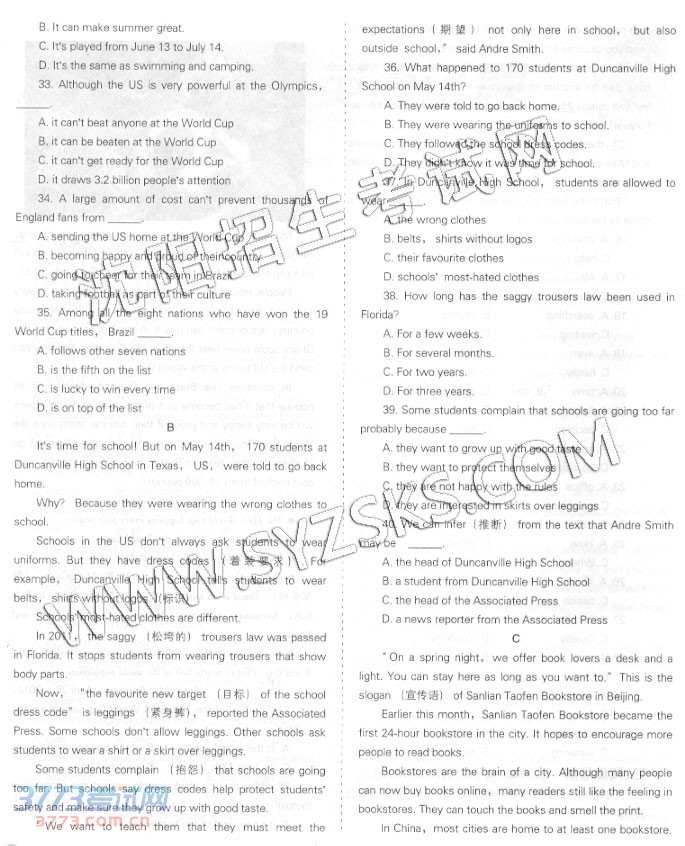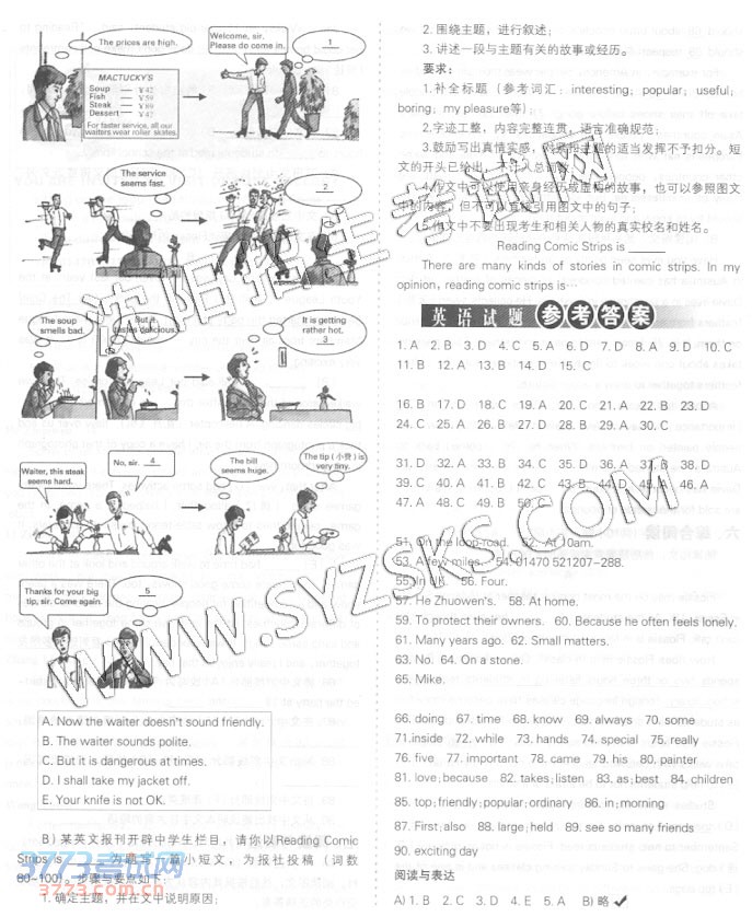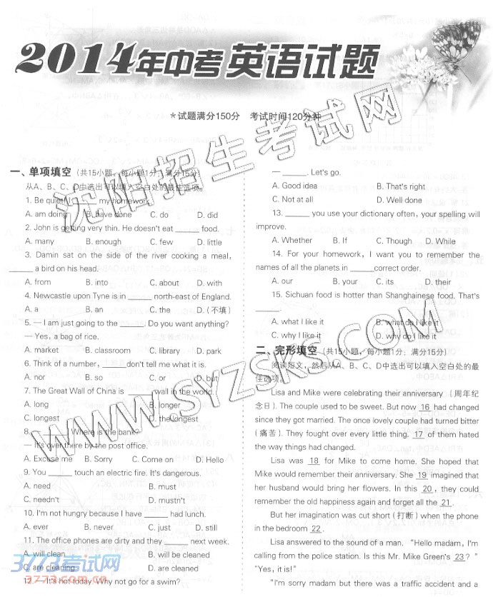 2014年沈阳市中等学校招生统一考试英语试题与参考答案