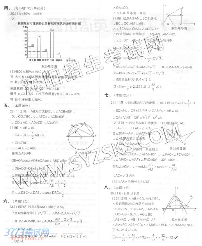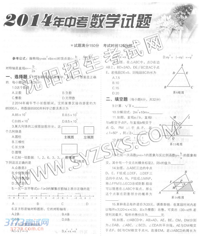 2014年沈阳市中等学校招生统一考试数学试题与参考答案