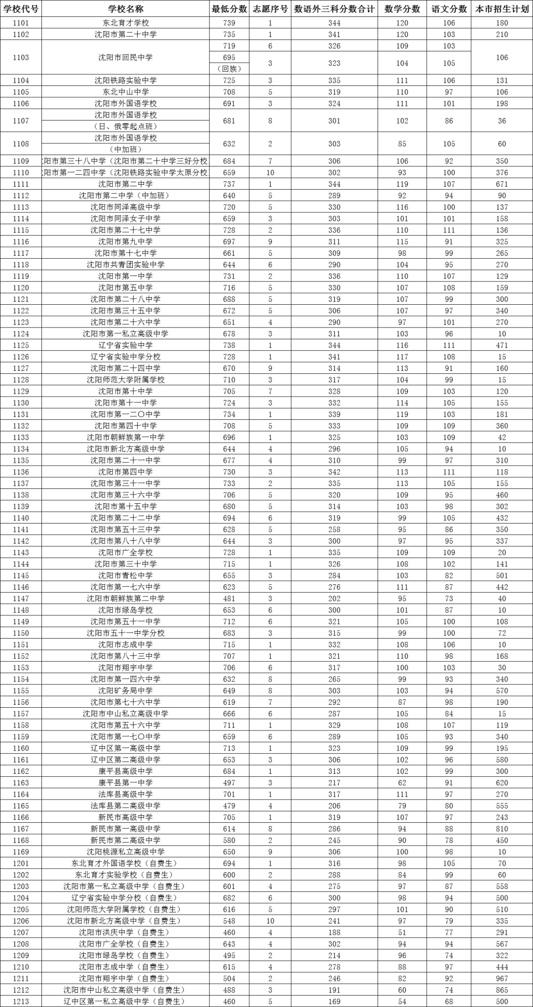 沈阳市第二十中学735分、沈阳市第一二〇中学734分、沈阳市第三十一中学733分……