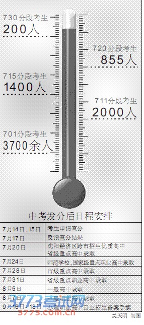 而2012年的相关数据为:740分段考生7人,730分以上考生210多人,720分以上考生1130人。720分是去年沈阳二中公费录取分数线。“今年720分人数只是略有减少,推断名校录取分数线可能会与去年持平,最多有一分左右的下浮。”一名业内人士推算说。