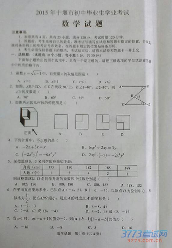 公布中考试题、答案和中考作文。祝各位考生都能取得好的成绩。2015年湖北十堰中考数学试题(图片版):