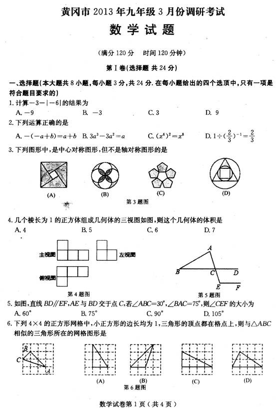 [组图]2013黄冈中考三月调考数学试题及答案
