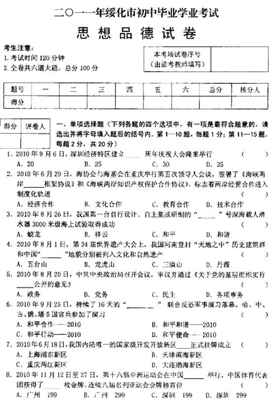 [组图]2011绥化中考思想品德(政治)试题试卷及参考答案