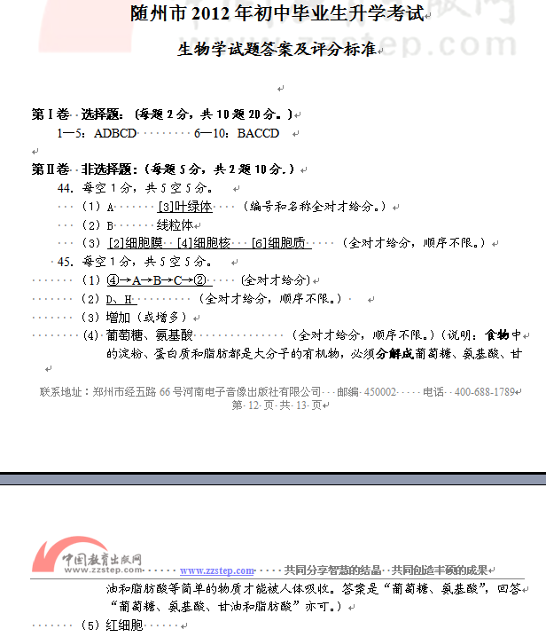 [组图]2012年随州中考理综生物试题答案