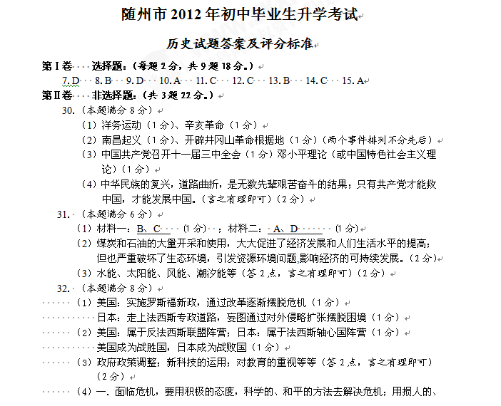 [组图]2012年随州市中考历史试题及答案