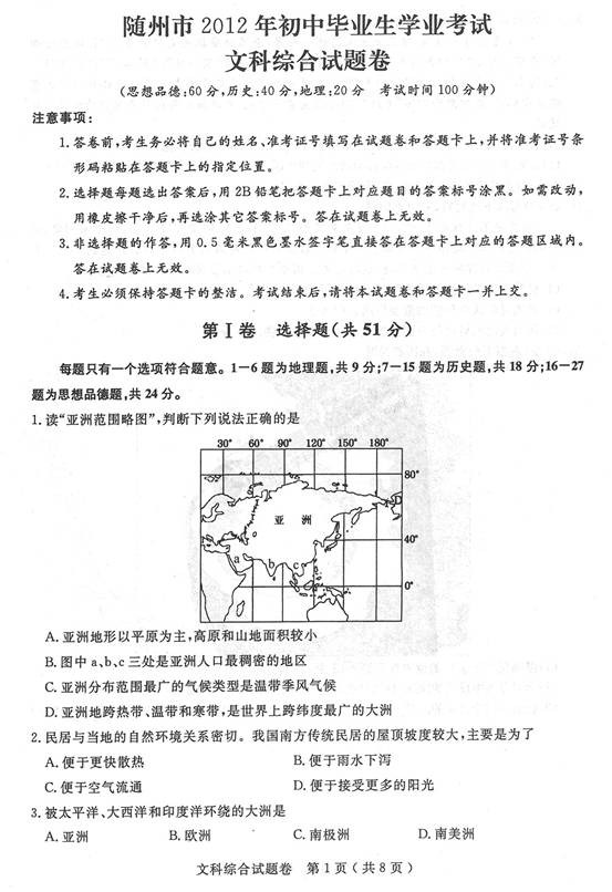 [组图]2012年随州中考地理试题及答案解析