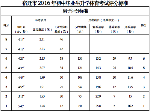 1.宿迁市2016年初中毕业生升学体育考试评分标准