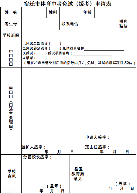 (1)申请免试、减试的学生须在3月20日前,由本人填写《宿迁市体育中考免试(缓考)申请表》,经申请学生本人、经监护人、班主任、分管校长签字,学校加盖公章后,并提供县级以上医院的诊断证明、病历(均为原件),其中残疾学生须提供宿迁市残联印发的《中华人民共和国残疾人证》原件及复印件。由学校统一于2016年3月底前报所在地教育主管部门审批确认后,方可免试。