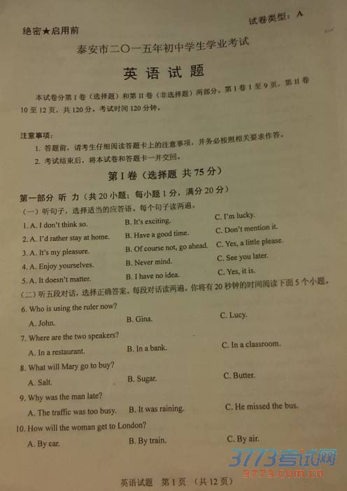 公布山东中考试题、答案和中考作文。祝各位考生都能取得好的成绩。2015年山东泰安中考英语试题(图片版):
