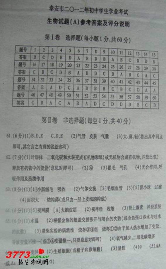 [组图]2012年泰安中考生物试题答案及评分标准