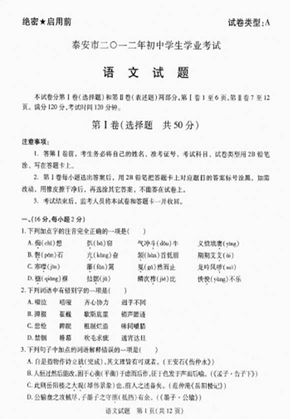 [组图]2012年泰安市中考语文试题及答案