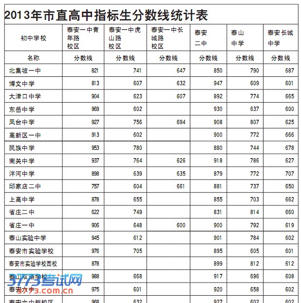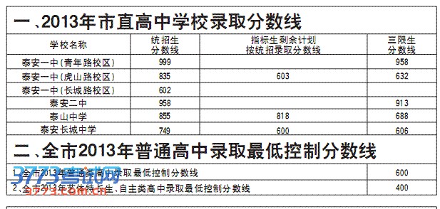 泰安一中(青年路校区)、泰安二中、泰山中学统招生分数线分别为999分、958分、855分,