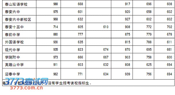 泰山双语学校的泰安一中(青年路校区)指标生分数线最高,为988分,