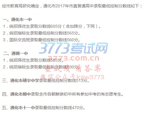 经市教育局研究确定,通化市2017年市直普通高中录取最低控制分数线如下:
