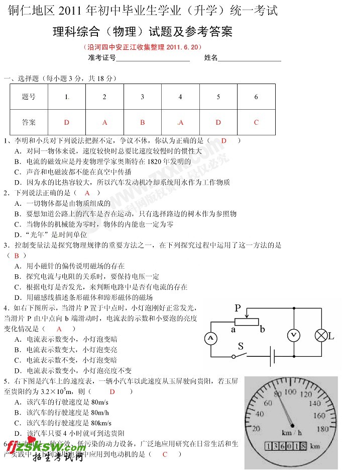 贵州铜仁2011中考理综试题及答案